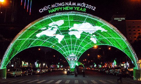 Một trong bốn cổng vòm trên đường Nguyễn Huệ thể hiện hình ảnh hành tinh xanh với các châu lục