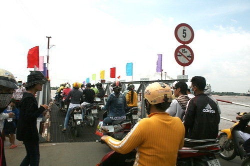 Cách bến phà 200m, nhiều nhân viên bến phà dàn hàng ngang chặn đoàn xe dừng lại để bán vé qua phà. Mua được vé nhưng muốn lên được phà phải chờ ít nhất một giờ. Nhiều lái xe mở cửa bước ra ngoài tán gẫu. Nhiều khách bộ hành cũng không thể lội bộ vượt qua đoàn xe để tiến về bến phà.