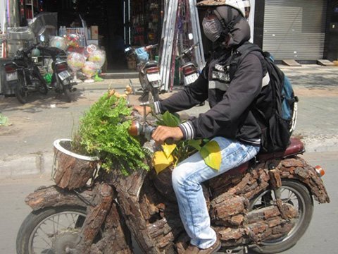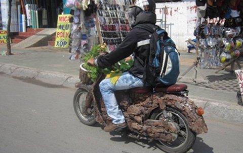 Chiếc xe nói trên trang trí khá độc đáo, thân xe giống như ghép bằng gỗ, phía trước đặt một chậu hoa. Chiếc xe không giống ai này chạy tới đâu cũng thu hút nhiều người hiếu kỳ chạy theo.