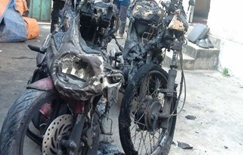Hai chiếc xe máy của vợ chồng anh Thụng chỉ còn trơ khung sắt (Ảnh: Dân trí).