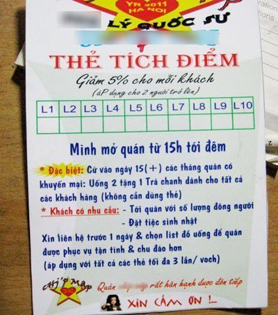 | Thẻ tích điểm (voucher) của một quán trà chanh trên đường Lý Quốc Sư, Nhà thờ Lớn. |