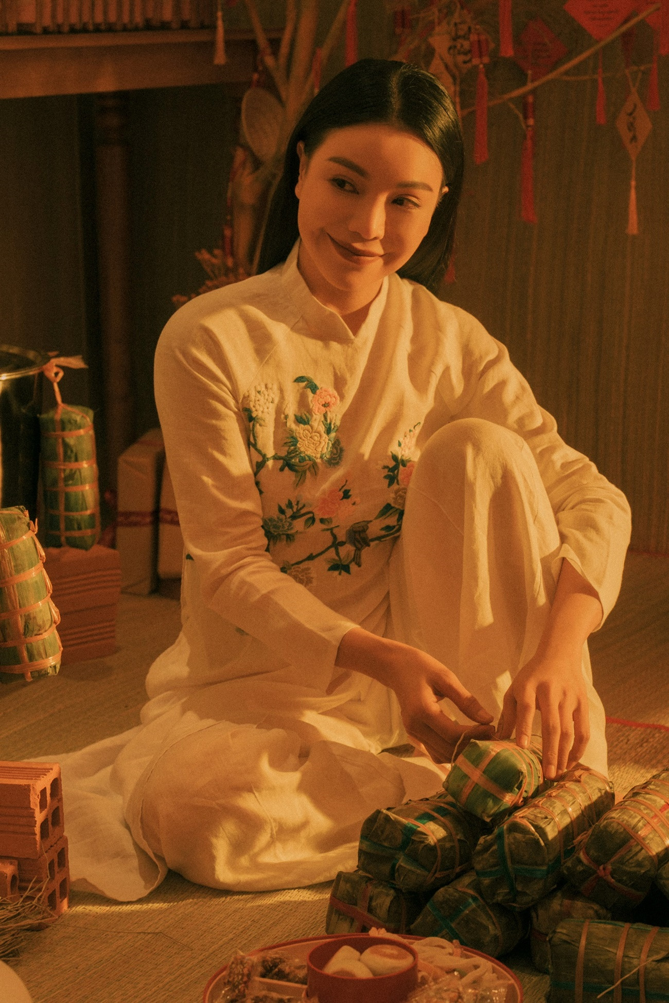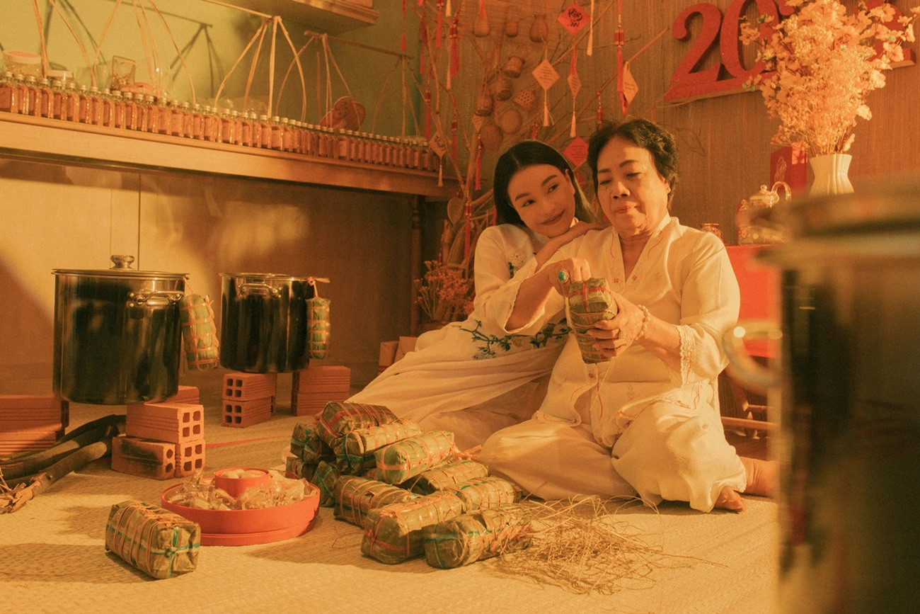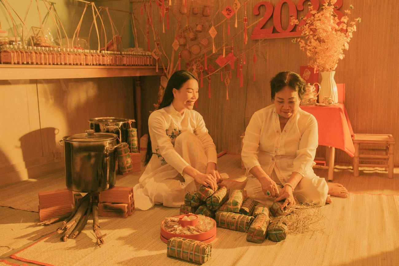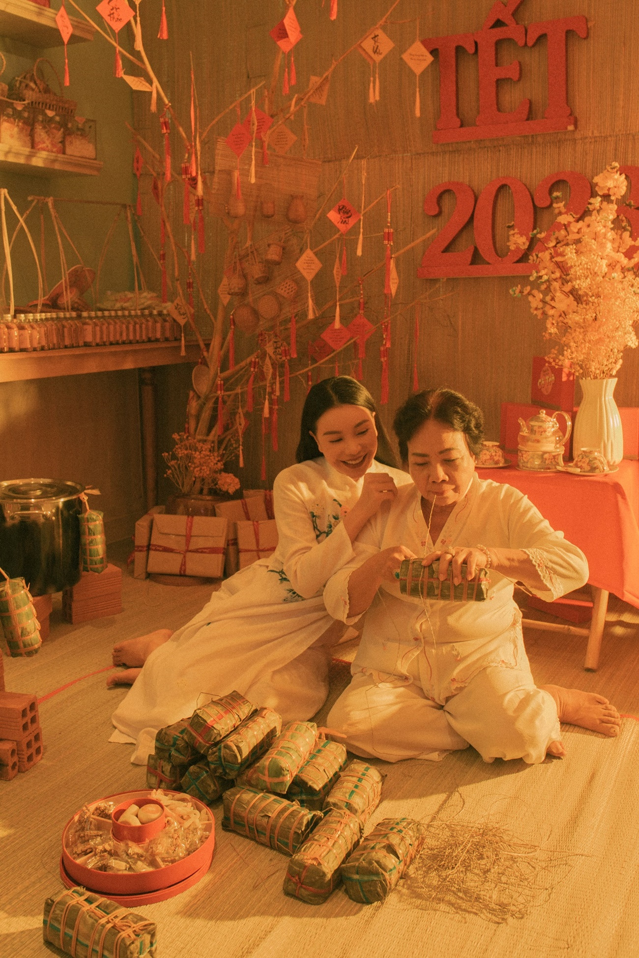 Trong bối cảnh nhà tranh, Trà Ngọc Hằng và mẹ cùng nhau gói bánh tét, bày biện mâm bánh mứt, trái cây,...