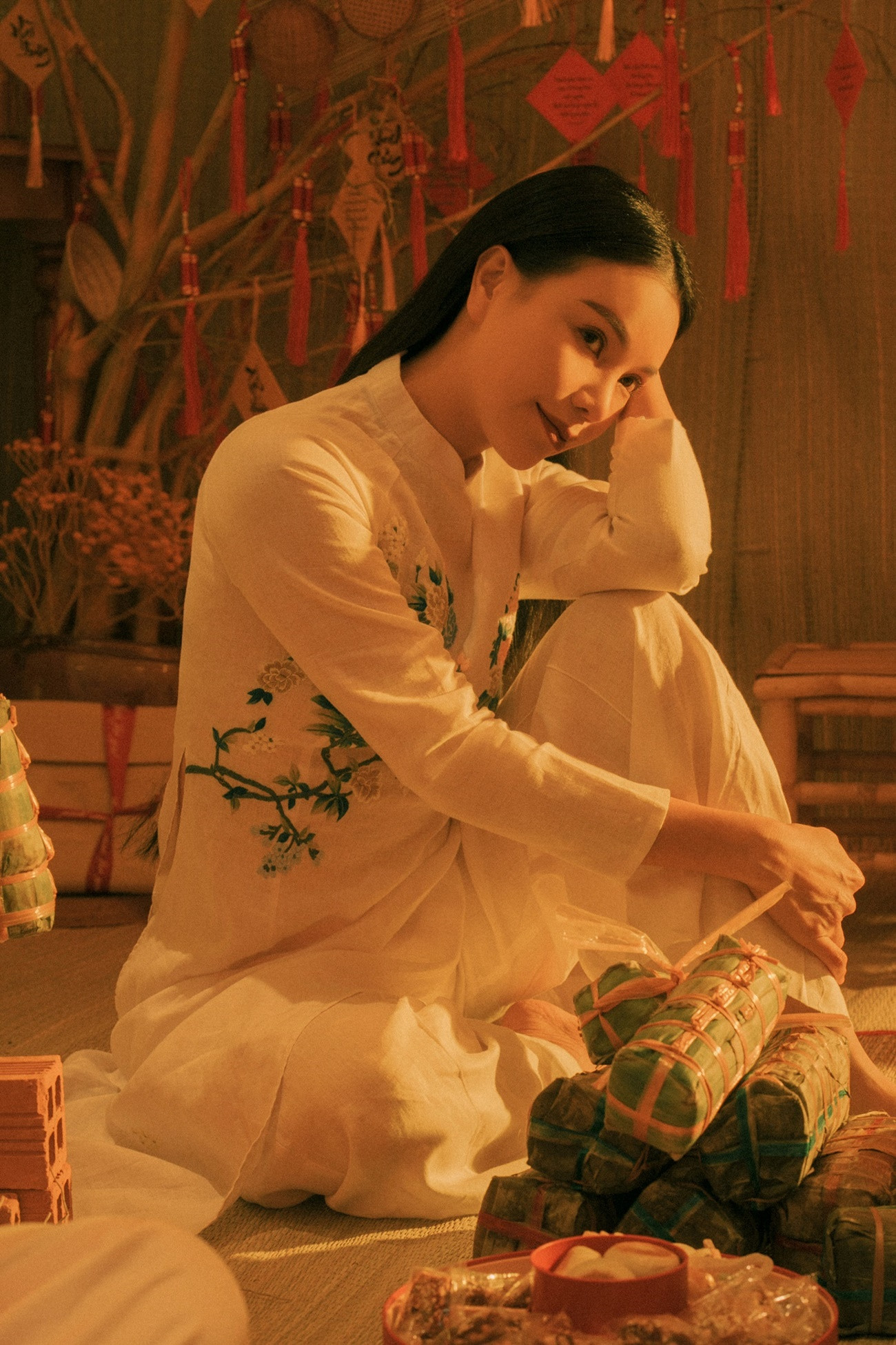 Trong bộ ảnh mới theo phong cách Tết xưa, Trà Ngọc Hằng diện áo dài màu trắng kem có họa tiết thêu tay. Cô đẹp nền nã, dịu dàng, khác phong cách gợi cảm thường thấy.