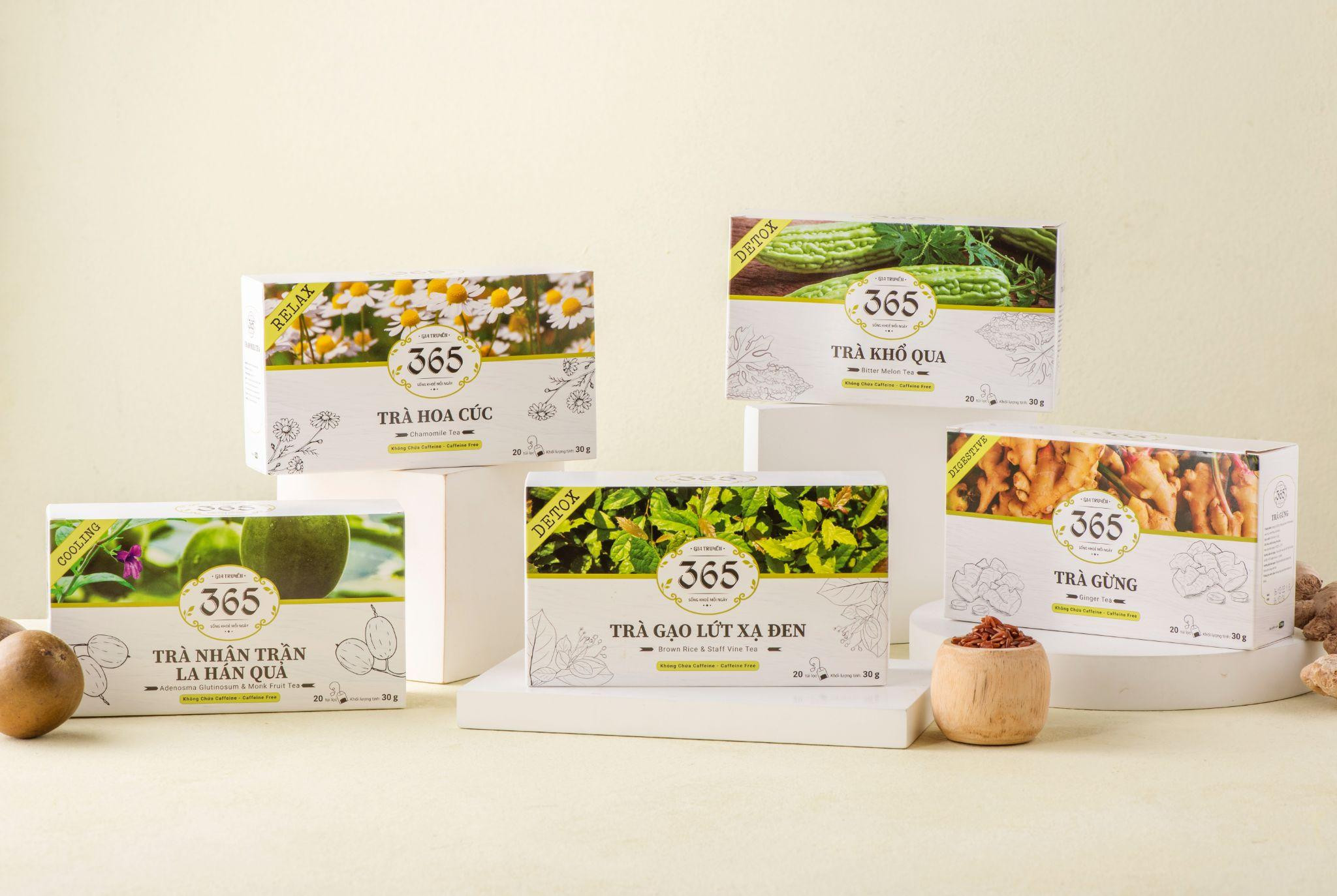 Trà thảo mộc 365 với các dòng sản phẩm như: trà gạo lứt xạ đen, trà hoa cúc, trà nhân trần la hán quả, trà gừng, trà khổ qua và trà atiso được chiết xuất hoàn toàn từ các nguyên liệu tự nhiên bao gồm: rễ, thân, lá của các loại thảo mộc tốt cho sức khỏe.