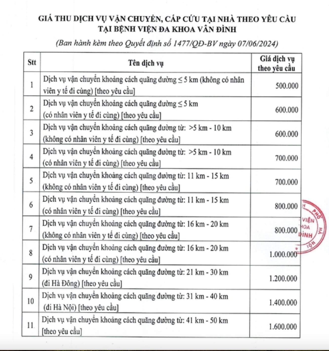 Ví dụ, tại Bệnh viện Đa khoa Vân Đình, dịch vụ vận chuyển bệnh nhân (theo yêu cầu) quãng đường dưới 5km không có nhân viên y tế đi cùng là 500.000 đồng; nếu có nhân viên y tế đi cùng là 600.000 đồng; với quãng đường từ 16-21km lần lượt là 800.000 đồng và 1 triệu đồng. Dịch vụ vận chuyển khoảng cách quãng đường từ 31-40km (đi Hà Nội) là 1,4 triệu đồng.