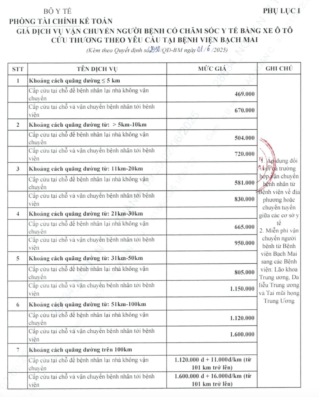Bệnh viện Bạch Mai đang áp dụng bảng giá tạm thời dịch vụ vận chuyển người bệnh có chăm sóc y tế bằng xe ô tô cứu thương theo yêu cầu từ bệnh viện về địa phương hoặc chuyển tuyến giữa các cơ sở y tế.