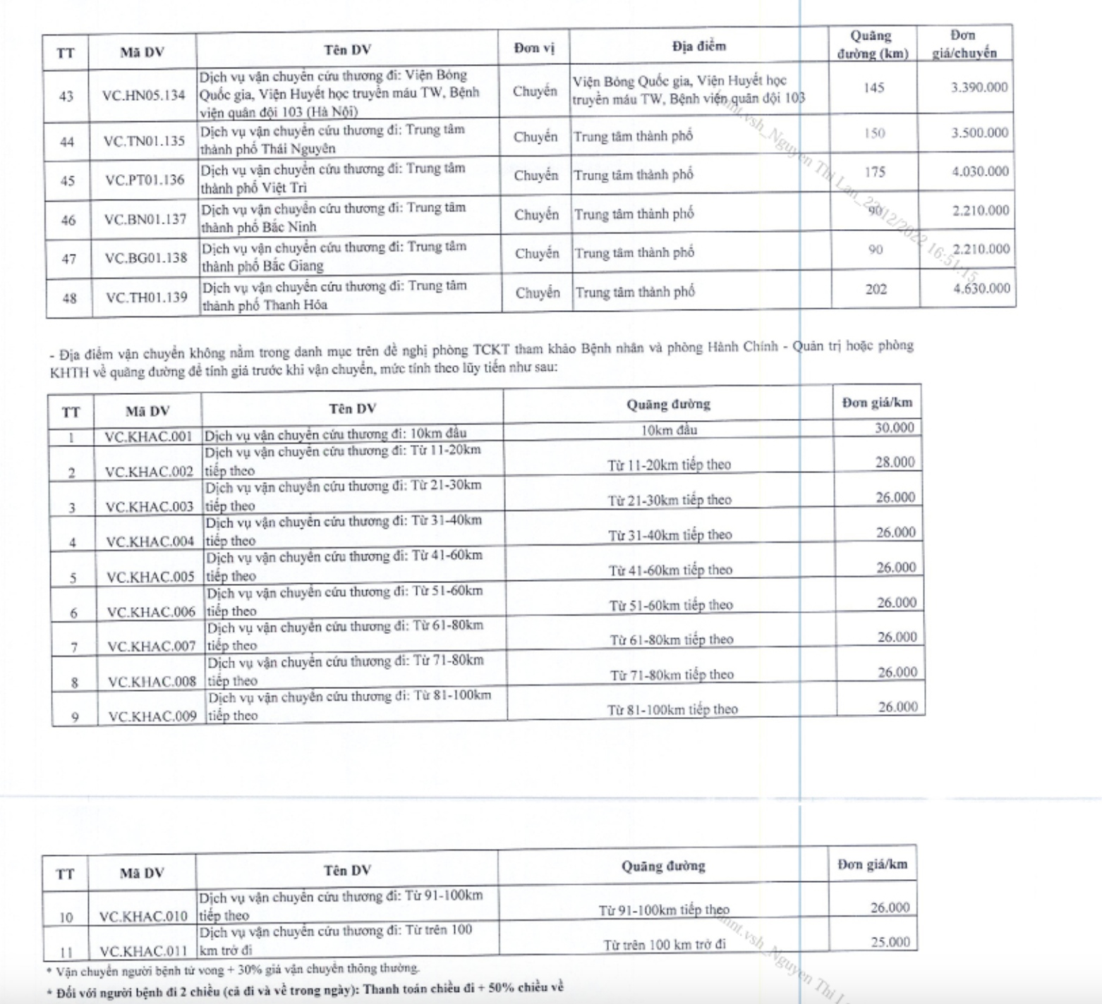 Bệnh viện lưu ý nếu địa điểm đến không nằm trong danh mục cụ thể thì phòng chuyên môn phải tham khảo về quãng đường để tính giá trước khi vận chuyển, mức tính theo lũy tiến quy định (như hình ảnh trên đây).