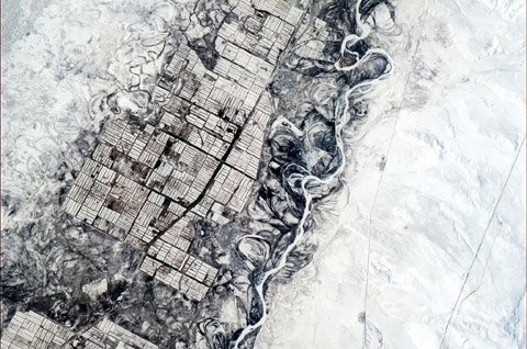 Con người cần các đường kẻ ngay ngắn, thiên nhiên thì không. Hình ảnh của những con sông và trang trại ngay ngắn ở Trung Á trong mùa đông.