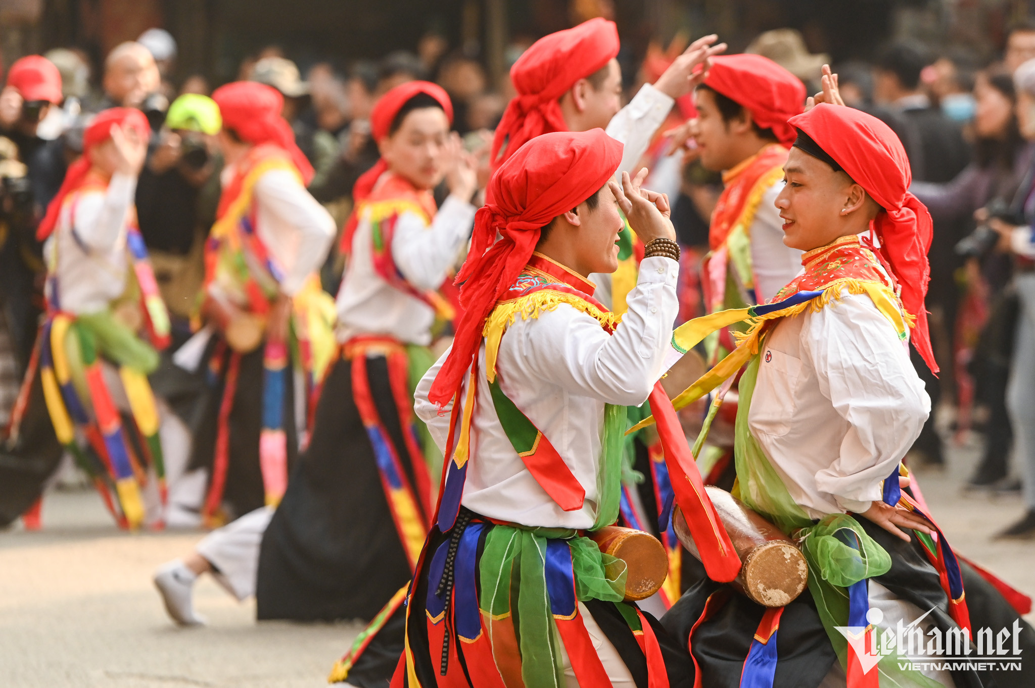 Dẫn đầu đoàn rước có 6 cặp trai giả gái mặt hoa da phấn, nhảy điệu múa bồng uyển chuyển, mềm mại. Họ đều phải có ngoại hình ưa nhìn, tươi tắn, ngoan ngoãn, con nhà gia giáo.