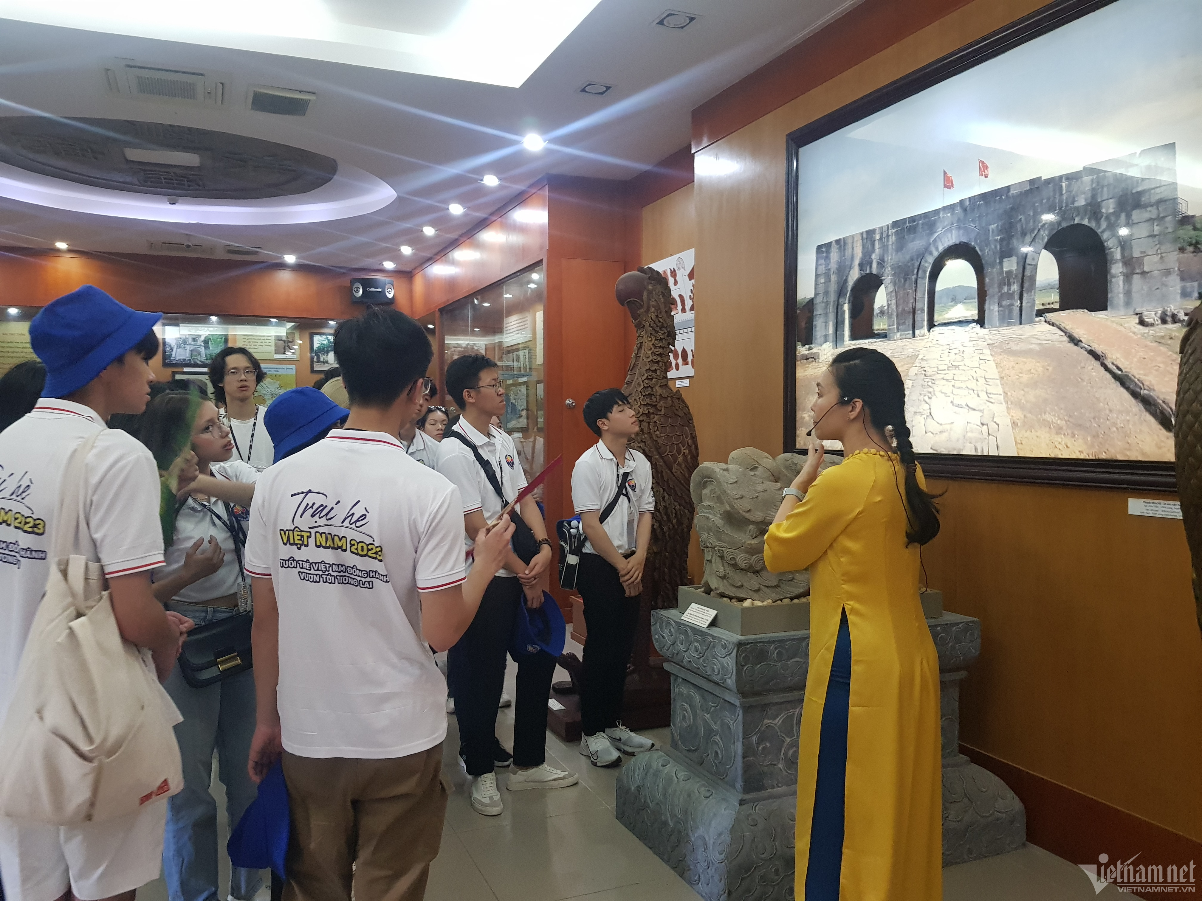 Hướng dẫn viên giới thiệu các hiện vật và giai đoạn đoạn lịch sử đến các bạn kiều bào trẻ.