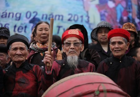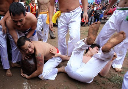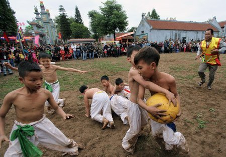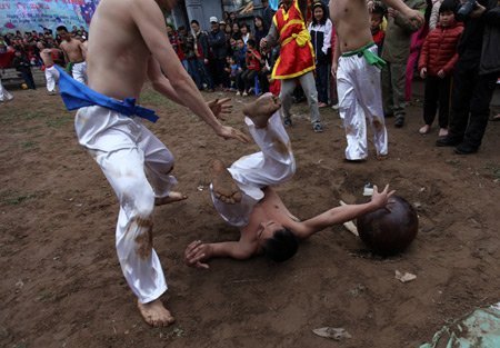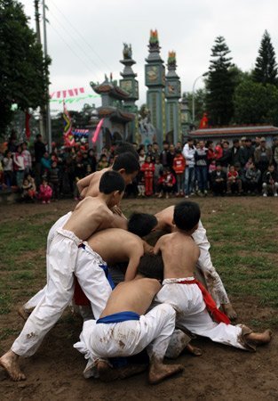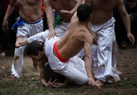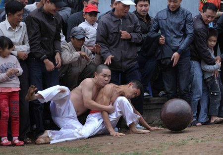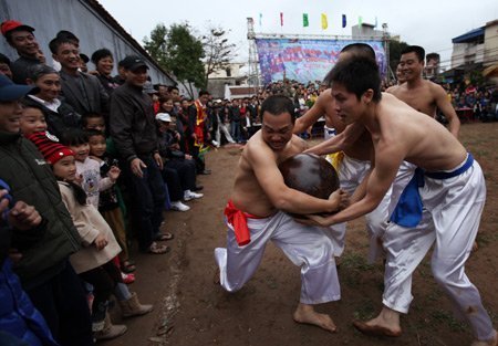 | Trận đấu giữa các tráng đinh phường là trung tâm của hội vật cầu. |