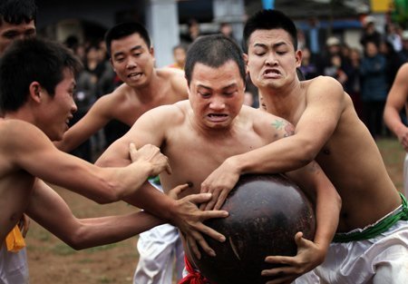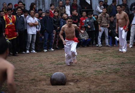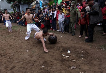 | Những tráng đinh "sức dài, vai rộng sẽ tranh quả cầu bằng gỗ mít nặng đến 25 kg. |