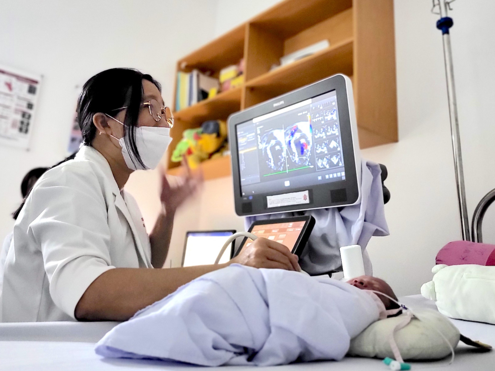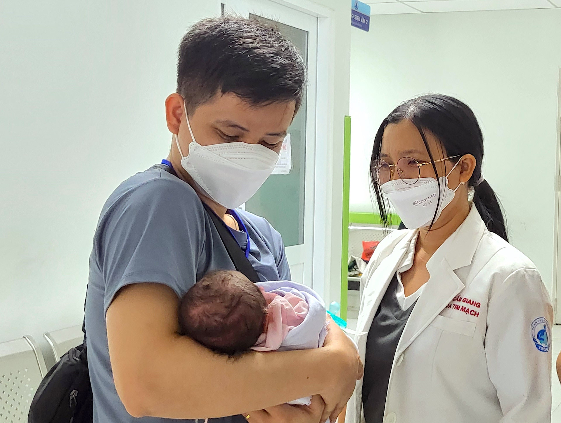 Người cha 31 tuổi rón rén ôm con trai 1 ngày tuổi đến gặp bác sĩ Đỗ Thị Cẩm Giang, Khoa Tim mạch, Bệnh viện Nhi đồng 1 TP.HCM để siêu âm tim. Cậu bé này vừa lọt lòng mẹ đã khiến phòng mổ vỡ oà bởi tiếng khóc lớn, vượt ngoài mong đợi của các bác sĩ. Đây là trường hợp được thông tim bào thai đầu tiên của Việt Nam cũng như ở Đông Nam Á.
