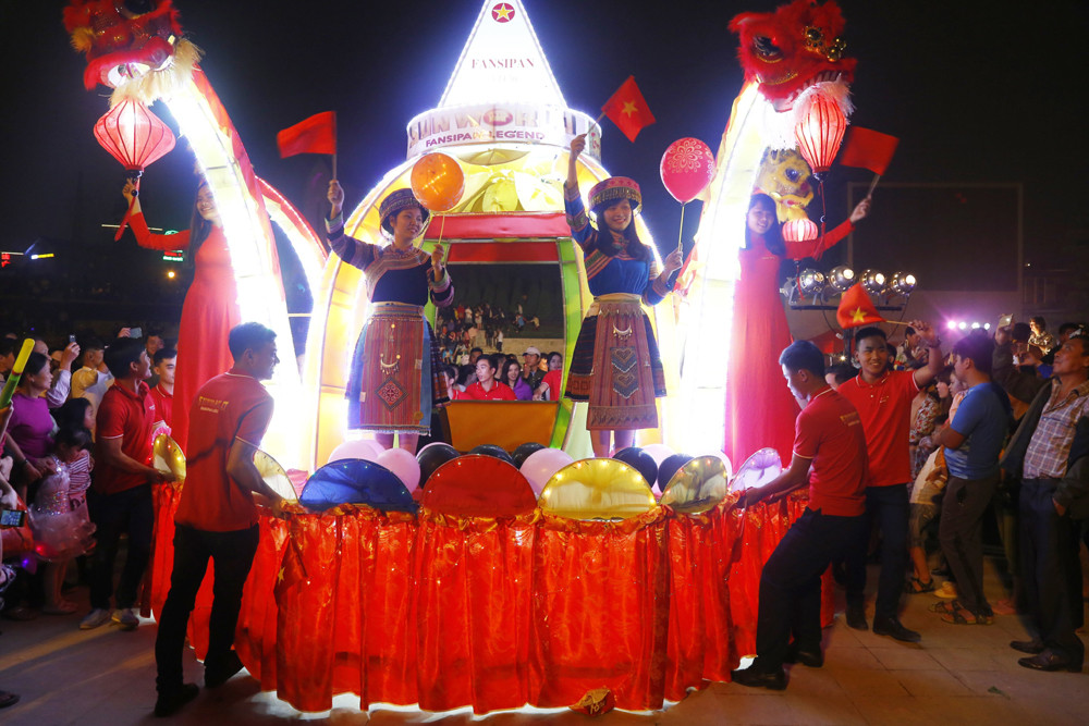 Hàng vạn người cùng diễu hành đèn từ Sân Quần đến các cung đường trung tâm Fan Si Păng, Thạch Sơn, Xuân Viên… Tiếng trống rền vang, cùng màn trình diễn nhộn nhịp của Chú Cuội, Chị Hằng và Lân Sư Rồng, những chiếc đèn Trung thu khổng lồ rực sáng khắp các con phố, hứa hẹn mời gọi bước chân du khách hòa cùng không khí tưng bừng của đêm hội.