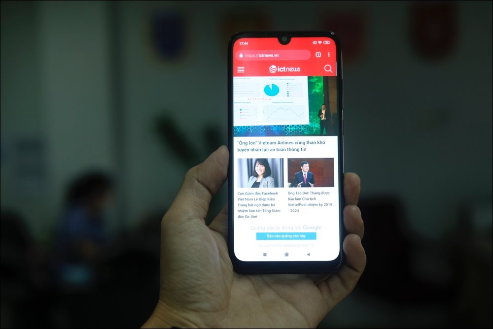 Mặt trước máy hiện rõ nỗ lực theo đuổi xu hướng tràn viền với viền hai bên mảnh mai. Ngược lại thì phần cằm bên dưới và viền trên vẫn còn khá dày, hoàn toàn phù hợp với tầm giá của máy. Phần giọt nước khá nhỏ vừa đủ chứa camera selfie và không gây khó chịu kể cả khi hiển thị video toàn màn hình.
