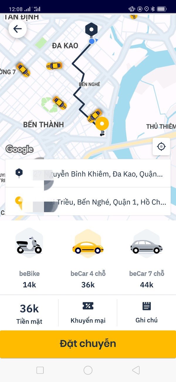Sau khi điền thông tin điểm đến và chọn “Đồng ý”, ứng dụng sẽ mở ra 3 tùy chọn phương tiện gồm beBike, beCar 4 chỗ, beCar 7 chỗ kèm với cước phí chi tiết.