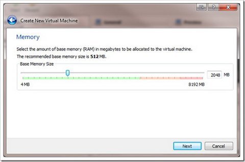 Giao diện chọn bộ nhớ RAM, bạn nên tăng lên 2GB (2048MB) để có thể "đỡ" được sức nặng của Windows 8.