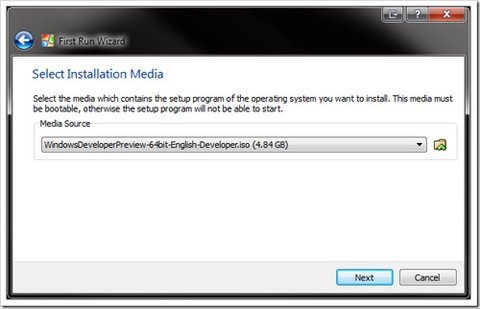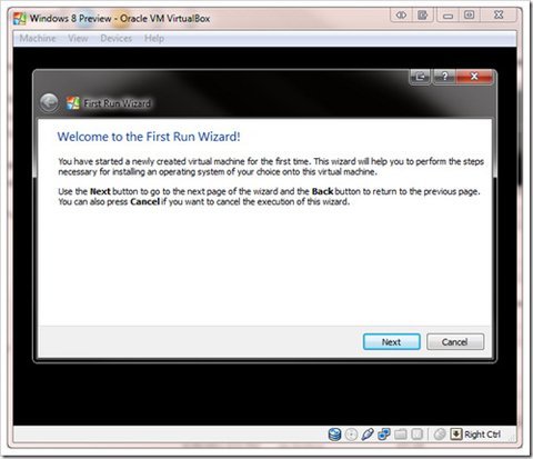 Sau khi tạo xong, bạn sẽ thấy ở khung trái của VirtualBox xuất hiện đĩa ảo với tên đã đặt trong phần Name trước đó. Nhấn vào đó, một cửa sổ giao diện mới xuất hiện, bạn làm theo các bước sau để cài đặt Windows 8 Developer Preview vào ổ ảo.