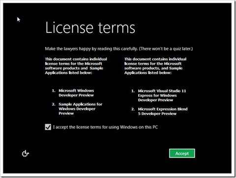 Giao diện đầu tiên hướng dẫn các bước cài đặt Windows 8 DP.