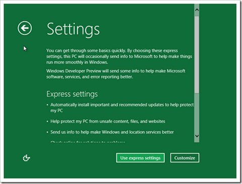 Phần thiết lập nhanh cho Windows 8 chọn "Use express settings". Tuy nhiên, nếu thích "vọc" nhiều hơn trong Windows 8 bạn nên chọn "Customize".
