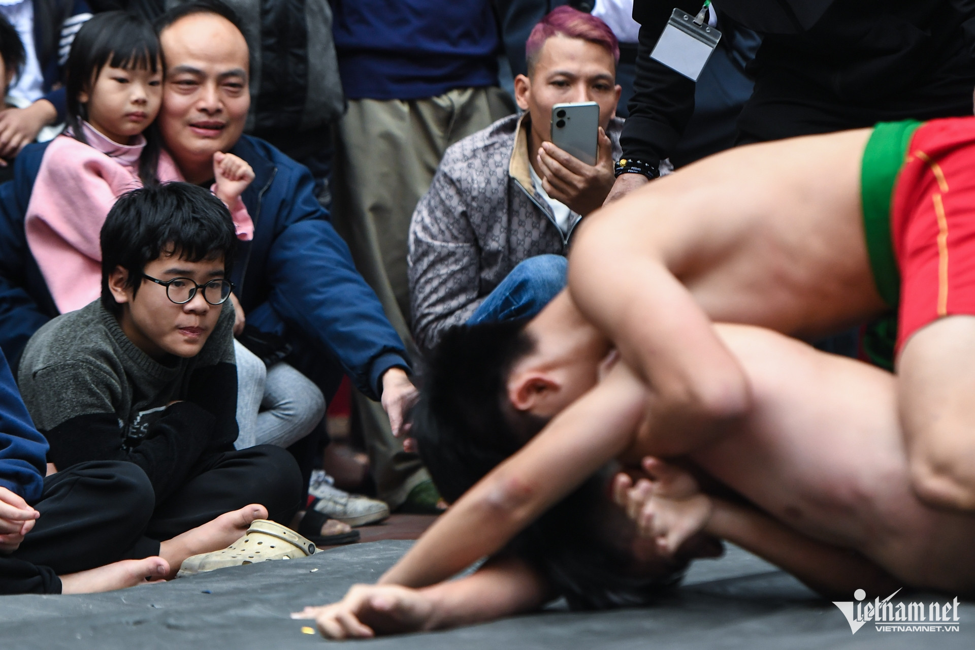 Trong ảnh, 2 đô vật nhí ở độ tuổi 13 đang trổ tài. Theo thể lệ, đối với hạng nhí, đô vật chiến thắng được thưởng 200.000 đồng, đô vật thua trận cũng được "lì xì" 100.000 đồng để lấy may đầu năm mới. Bởi tính chất lễ hội đón xuân, cầu may mắn, sức khỏe, nhiều du khách lì xì thêm cho các đô vật nếu thấy trận đấu thú vị, bắt mắt.