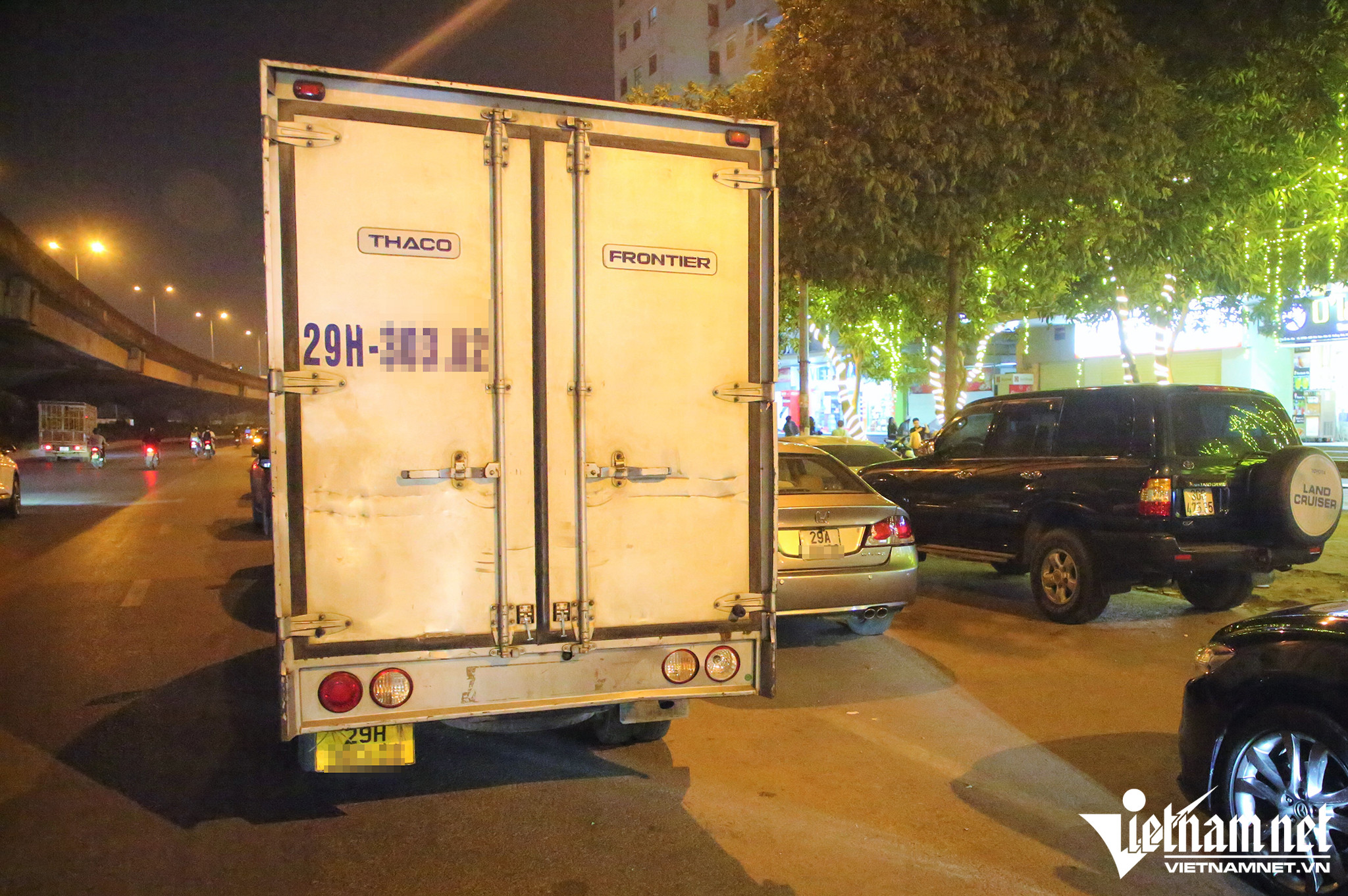Ô tô đỗ chiếm lòng đường tại đây đa dạng về chủng loại từ ô tô con đến xe tải, toàn bộ các xe đỗ đều không có cảnh báo an toàn.