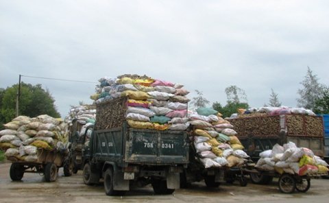 | Xe chở sắn ứ trước cổng Nhà máy tinh bột sắn Fococew. |