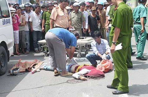 Tại hiện trường, một cô gái nằm dưới bánh xe tải, đầu bị dập nát, máu chảy lênh