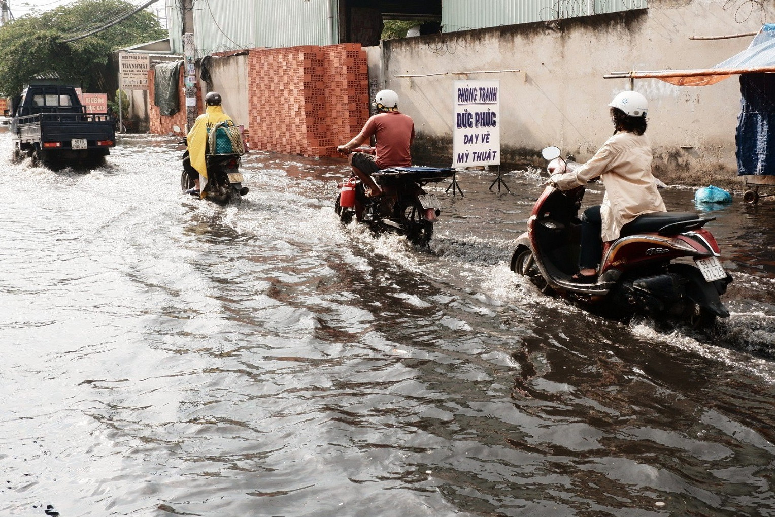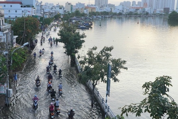 Tại quận Bình Tân, đoạn đường Sinco qua phường Bình Trị Đông B bị ngập nặng sau cơn mưa. Nước ngập sâu khoảng 30-40cm với màu đen ngòm, bốc mùi hôi thối. Hai bên đường, mọi hoạt động sinh hoạt, kinh doanh bị ảnh hưởng.