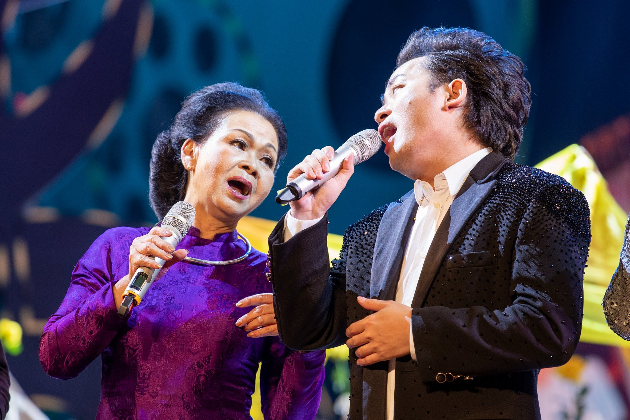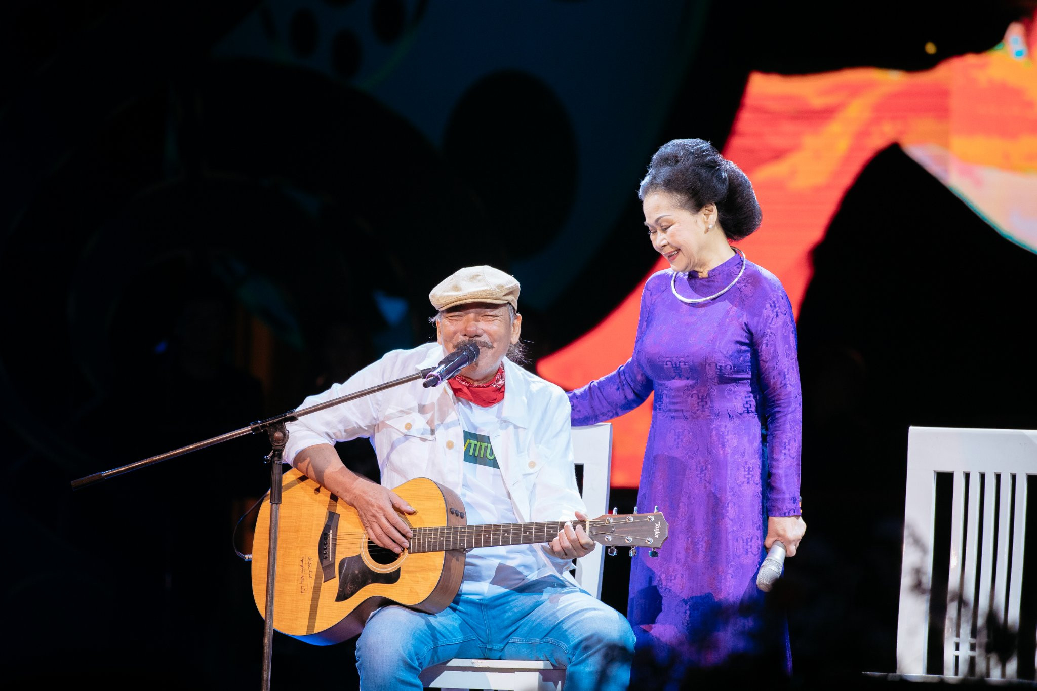 Khoảnh khắc nhạc sĩ Trần Tiến đệm đàn và song ca Bên đời hiu quạnh cùng danh ca Khánh Ly vô cùng ấn tượng trong đêm nhạc.