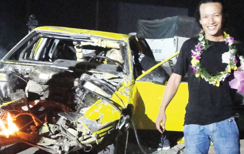 | Chiếc ô tô nát phần đầu sau khi Trần Như Thục bay với vận tốc 120 km/giờ |