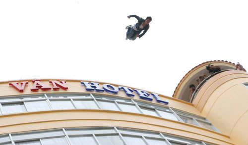 Hôm Ân thực hiện cảnh quay, rất đông người đứng ken chật bãi sau Thùy Vân để xem pha đóng thế nghẹt thở này. Phía dưới đất được bảo hộ bằng thùng giấy và nệm, với diện tích 100 m2. Đến 11 giờ trưa, Ân lao người xuống, mọi người nín thở xem, không ít người đã khóc tức tưởi vì tưởng Ân đã chết. “Sau này, khi về xem lại đoạn phim, mình không biết tại sao lại thực hiện được pha này”, Ân nói.