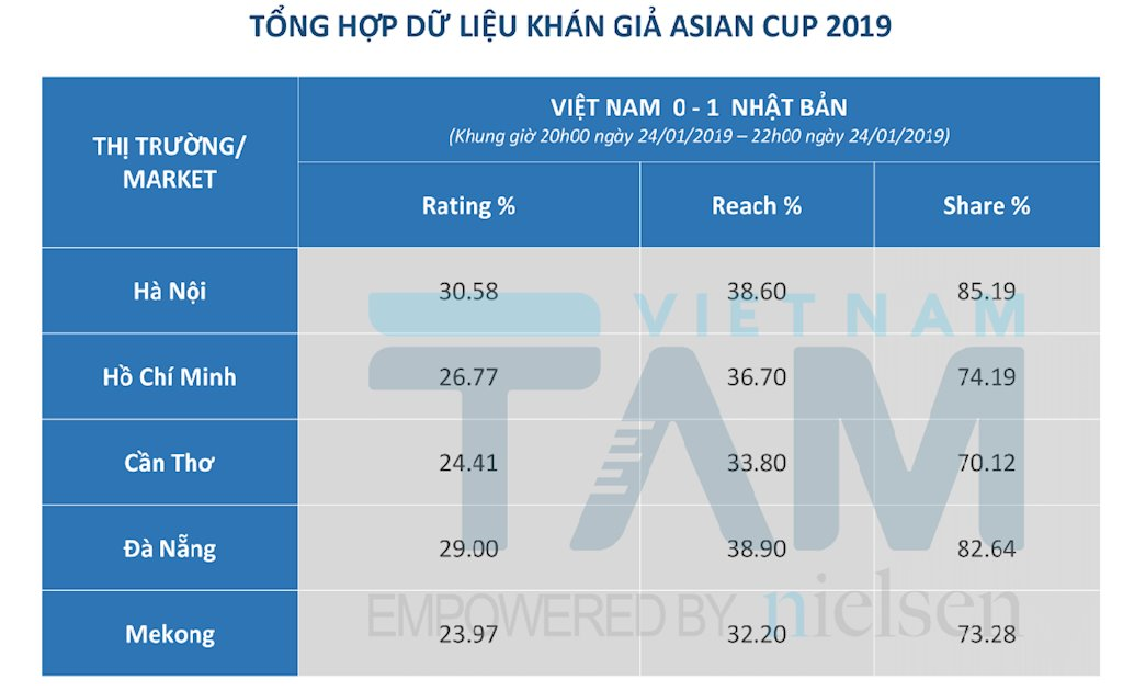 Theo số liệu đo lường dữ liệu khán giả xem truyền hình từ VietnamTam, trận tứ kết Asian Cup 2019 giữa ĐT Việt Nam và ĐT Nhật Bản vào 20h ngày 24/1/2019 đã lập một kỷ lục mới về lượt khán giả theo dõi qua truyền hình.