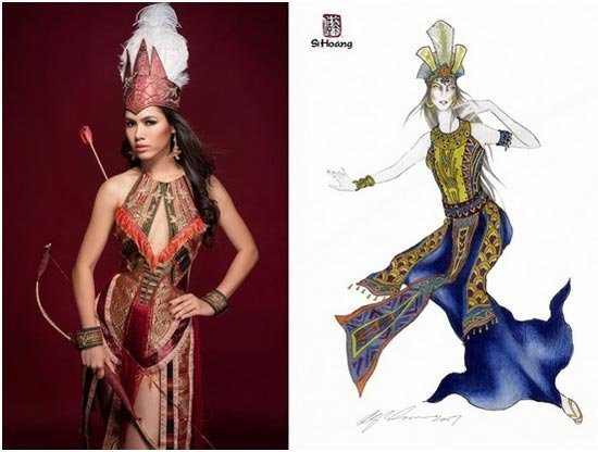 - Đó không phải trang phục lấy ý tưởng từ câu chuyện Mỵ Châu - Trọng Thủy. Trang phục của Mỵ Châu theo như mọi người hình dung sẽ có áo lông ngỗng, có nỏ thần. Ở đây Hoàng My không mặc áo lông ngỗng, tay cũng không cầm nỏ thần. Dù thời gian rất gấp rút nhưng bộ trang phục dân tộc của Hoàng My được tôi và ê kíp ngồi lại bàn bạc rất kỹ càng. Hoàng My nói với tôi rằng cô ấy cần một bộ trang phục dân tộc thật ấn tượng nhưng phải đáp ứng được tiêu chí gọn nhẹ và có thể giúp cô ấy cảm thấy thoải mái, dễ chuyển động khi trình diễn trong phần thi Dances of The World, từ đó bộ trang phục lấy ý tưởng từ trang phục của người Âu Lạc được ra đời.