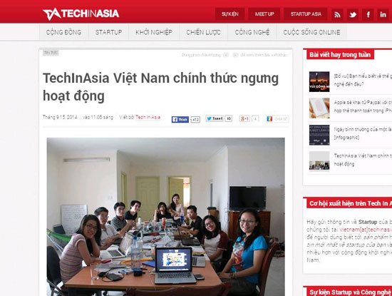 TechInAsia được biết đến là trang thông tin online về startup công nghệ có mặt tại nhiều quốc gia Châu Á và Hoa Kỳ với đội ngũ cộng tác gồm nhiều nhà báo và blogger.