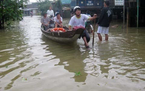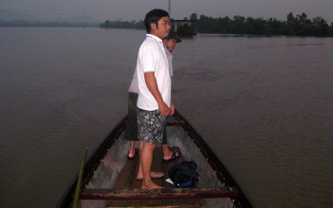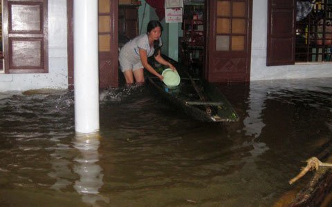 Chị Nguyễn Thị Thông ở thôn Hoàng Đàm đang tát nước trong chiếc thuyền nhỏ nói: “Do mưa lớn, nước ngập nhanh gai đình chúng tôi trở tay không kịp. Bây giờ cứ ngồi trên thuyền chòng chành chờ hàng cứu trợ đến. Chứ thuyển nhỏ thế này không đi ra ngoài nước sông sóng lớn quá”.