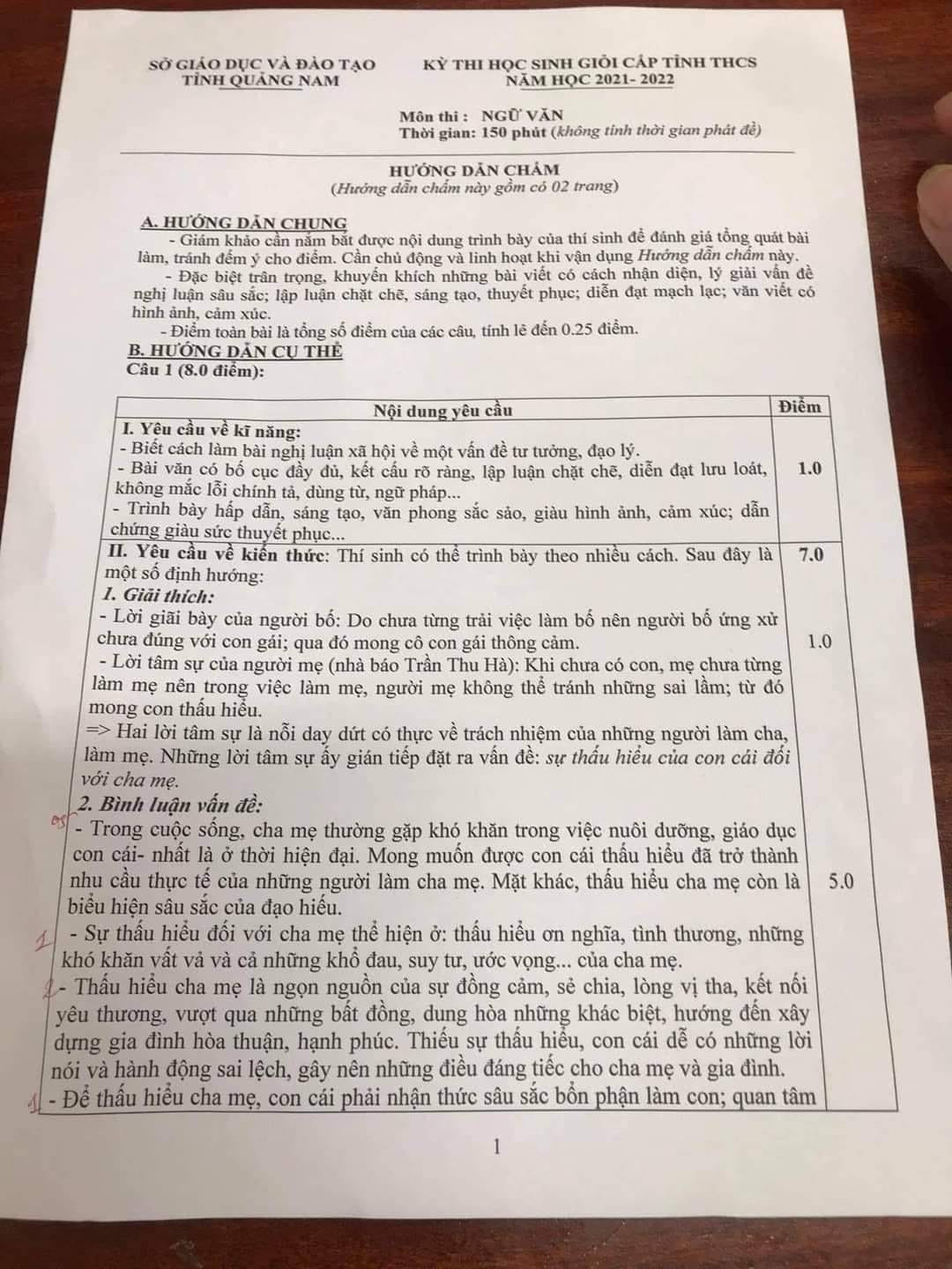 Trước đó, mạng xã hội Facebook lan truyền một đề thi học sinh giỏi môn Ngữ văn, vào ngày 19/4 vừa qua tại tỉnh Quảng Nam về: “Sự thấu hiểu của con cái đối với cha mẹ”. Nội dung đề thi câu 1 với 8 điểm là nghị luận xã hội có nội dung: a. Trong bộ phim "Repply 1988" sau những ứng xử thiếu tinh tế đối với cô con gái tên Duk Sun, người bố giãi bày: Bố không phải vừa sinh ra đã làm bố, bố cũng là lần đầu tiên làm bố. b. Trong bài viết: Nếu ba mẹ lỡ không may đi xa lạc mình, hãy chỉ đường, hướng dẫn, kéo tay ba mẹ với nhé!, nhà báo Trần Thu Hà chia sẻ: Mẹ tuy nhiều tuổi hơn nhưng về việc làm mẹ, mẹ cũng chỉ bằng tuổi con. Con lúng túng, mẹ cũng lúng túng; con sai lầm, mẹ cũng sai lầm. Con thất vọng về mẹ có khi còn ít hơn mẹ thất vọng về chính mình nữa. Từ những lời tâm sự trên, em hãy trình bày suy nghĩ về vấn đề: sự thấu hiểu của con cái đối với cha mẹ". |