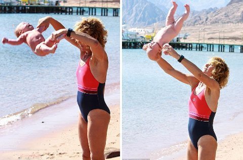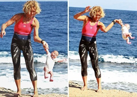 Nhiều người đã thực sự "choáng" khi thấy bà Fokina nắm một tay trẻ, đong đưa nó trong không khí và tung qua đầu. Ảnh: Barcroft Media |