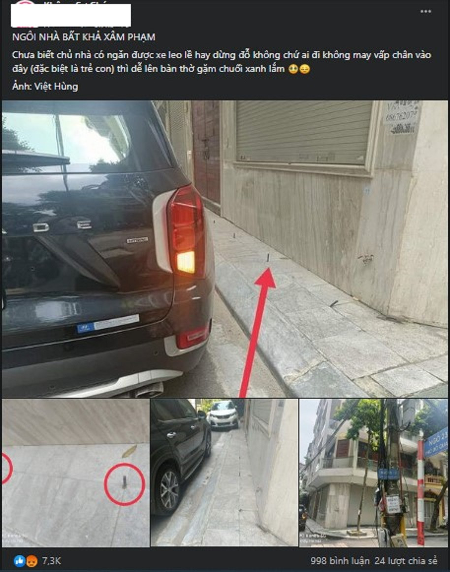 Mới đây, những hình ảnh về một ngôi nhà “bất khả xâm phạm” tại phố Đỗ Quang, Hà Nội đã được đăng tải trên nhiều hội nhóm ở Facebook và nhận được không ít ý kiến trái chiều. Theo hình ảnh được đăng tải, chủ nhân của ngôi nhà này đã đóng một hàng cọc sắt như bàn chông trên phần vỉa hè trước nhà mình. Có thể dễ dàng nhận ra mục đích của chủ ngôi nhà này là nhằm ngăn chặn ô tô đỗ trước cửa.