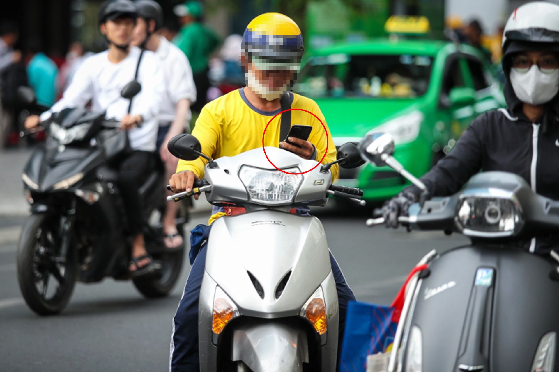 Thói quen rút điện thoại “giết thời gian” dễ dàng bắt gặp ở các nút giao, từ giờ tan tầm đông đúc đến cả lúc đường phố thưa vắng. Ảnh NT, LT