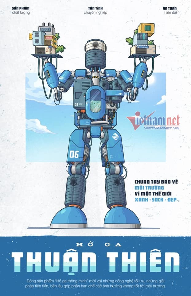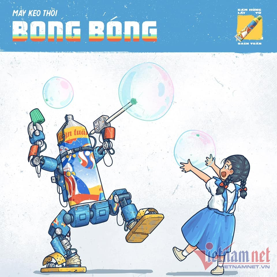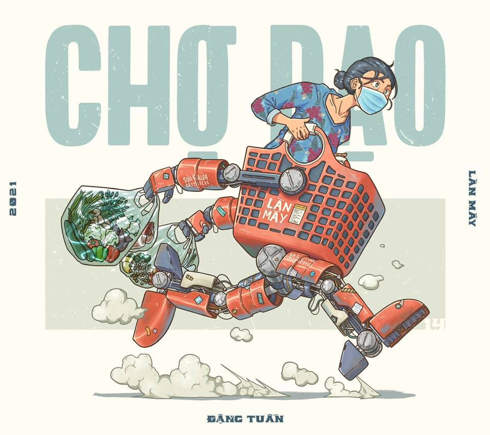 Bức tranh “Hà Nội rong” được lấy cảm hứng từ hình ảnh người “robot” hiện đại với đôi quang gánh truyền thống là chiếc cầu, gánh trên vai các di tích quen thuộc của Hà Nội như Văn Miếu Quốc Tử Giám, Chùa Một Cột, Lăng Bác… và các hàng cà phê, phở...