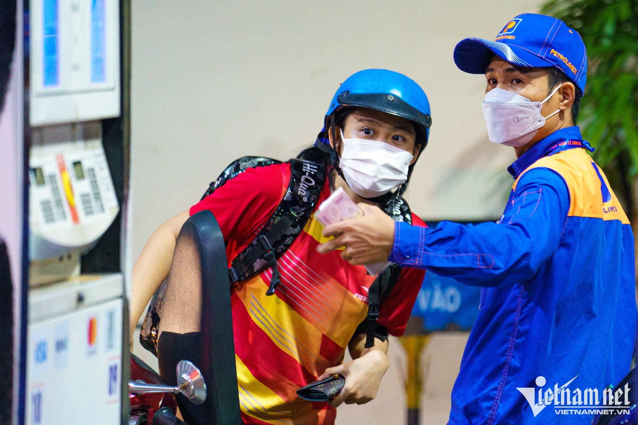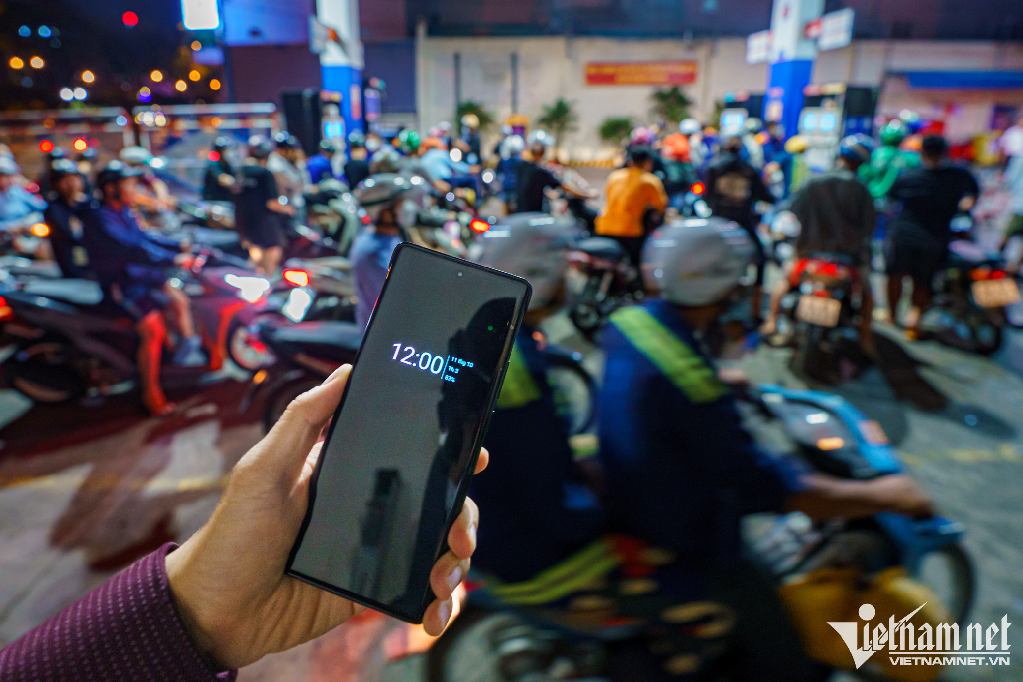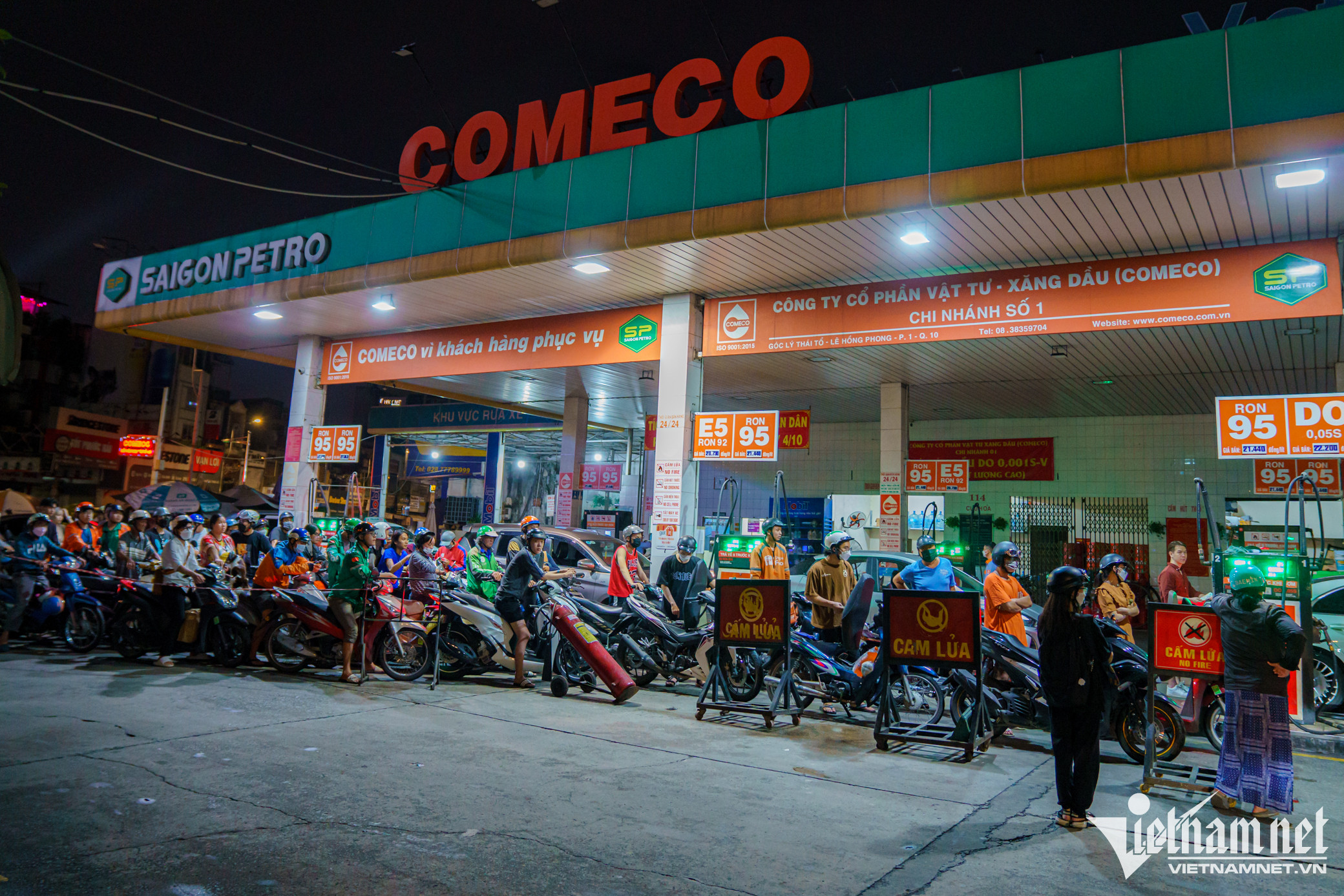 Số lượng cây xăng tại TP.HCM hết hàng phải tạm ngưng hoạt động tăng lên con số 67 trong ngày 10/10. Điều này khiến tình hình mua bán xăng dầu trên địa bàn càng lúc càng căng thẳng. Dòng người đi xe máy xếp hàng dài tràn ra đường tại cây xăng trên đường Trần Não từ tối đến nửa đêm. Lúc 0h ngày 11/10, cây xăng trên đường Bến Vân Đồn (quận 4) vẫn tấp nập khách đến đổ xăng. Hình ảnh này được cho là khác lạ so với ngày thường.Hàng trăm khách vây kín cả 3 trụ bơm. Có lúc trạm xăng tăng cường thêm 2 trụ bên trong để hỗ trợ một số trường hợp cấp bách. Nhân viên cây xăng làm việc liên tục. Cửa hàng trưởng cũng ở lại hỗ trợ đến gần 1h sáng. Tại các trụ tự phục vụ, tài xế taxi luân phiên nhau bơm xăng không ngừng nghỉ.Thùy Dương (quận 8) cho biết đã đi tìm xăng để mua lúc trưa và chiều nhưng do gặp cảnh xếp hàng dài chờ đợi khiến chị phải quay về. "Tôi quyết định đi lúc 0h để được hưởng sự vắng vẻ, thoải mái nhưng không ngờ cũng có nhiều khách như vậy", Dương chia sẻ.Anh Nguyễn Trường Trí Hải đi đổ xăng lúc 0h cho vắng, nhưng bất ngờ thấy lượng người xếp hàng đông không kém so với ban ngày. "Tôi đi làm về từ 21h, nghĩ rằng 0h ra đổ xăng sẽ không phải chờ đợi lâu nhưng cuối cùng vẫn phải chờ hơn 30 phút mới có được bình xăng", anh Hải kể.Trạm xăng dầu ở góc đường Lý Thái Tổ - Lê Hồng Phong (quận 10) đã hoạt động trở lại sau khi được cung cấp thêm hàng. Ngay khi mở bán, khách hàng xếp hàng trật tự vào mua xăng lúc nửa đêm.Lúc 0h30, dòng người chờ mua xăng kéo dài hơn chục mét. Trạm này bán với số lượng khá nhỏ giọt, giới hạn mỗi người chỉ được mua tối đa 50.000 đồng.Do đã quá khuya lại phải chờ đợi lâu, phần lớn khách tỏ ra mệt mỏi. Anh Huy cho biết dù mệt nhưng vẫn cố chờ để có nhiên liệu mà đi. "Thông thường, đổ xăng chỉ vỏn vẹn vài phút là xong, nhưng mấy hôm nay tôi phải mất ít nhất 30 phút mới đến lượt", anh Huy nói.Anh Huy Hùng mắt díp lại trong lúc xếp hàng chờ đổ xăng. "Cả ngày đi làm đã quá mệt mỏi, nghĩ tranh thủ khuya ra đổ nhanh rồi về, nhưng không ngờ chờ vẫn phải chờ đợi lâu đến vậy", anh phàn nàn.Đến 1h sáng, cây xăng đối diện khách sạn New World vẫn đón lượng khách liên tục đổ về. Cửa hàng này vẫn bán xăng cho khách mua bằng can, chai nhựa với dung tích từ 1,5-30 lít.