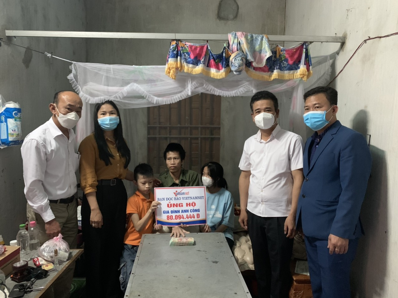 Sau khi Báo VietNamNet đăng tải bài viết, hoàn cảnh của gia đình anh Công được nhiều nhà hảo tâm biết đến và ủng hộ gia đình anh hơn 80 triệu đồng. Dưới sự chứng kiến của Chủ tịch UBND huyện Lộc Hà Nguyễn Việt Hùng, ông Lê Tiến Lương Chủ tịch UBND xã Thạch Mỹ, PV Báo VietNamNet đã trao món quà của độc giả tới gia đình anh Công.