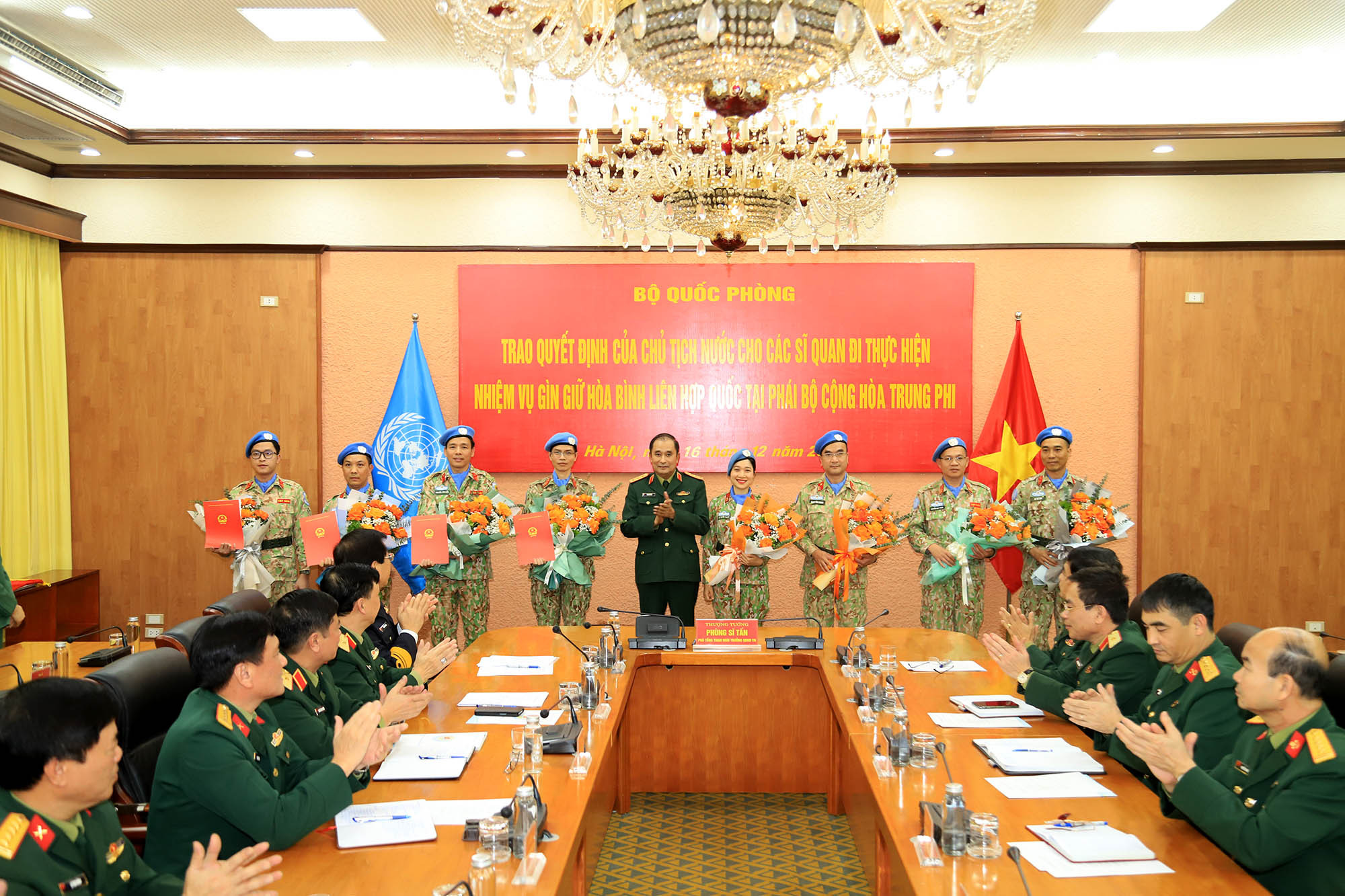 Trao quyết định và giao nhiệm vụ, thay mặt Quân uỷ Trung ương, Bộ Quốc phòng, Thượng tướng Phùng Sỹ Tấn, Phó Tổng tham mưu trưởng QĐND Việt Nam chúc mừng các sĩ quan hoàn thành nhiệm vụ và các sĩ quan mới nhận nhiệm vụ chuẩn bị lên đường.
