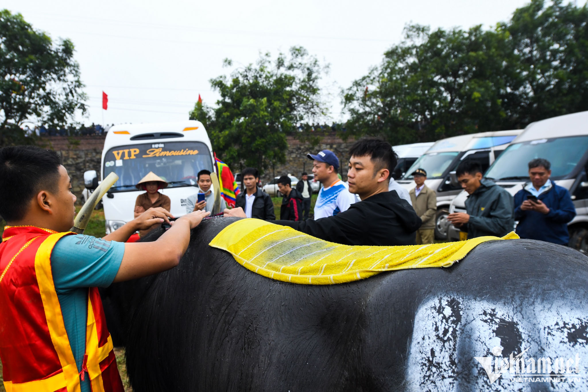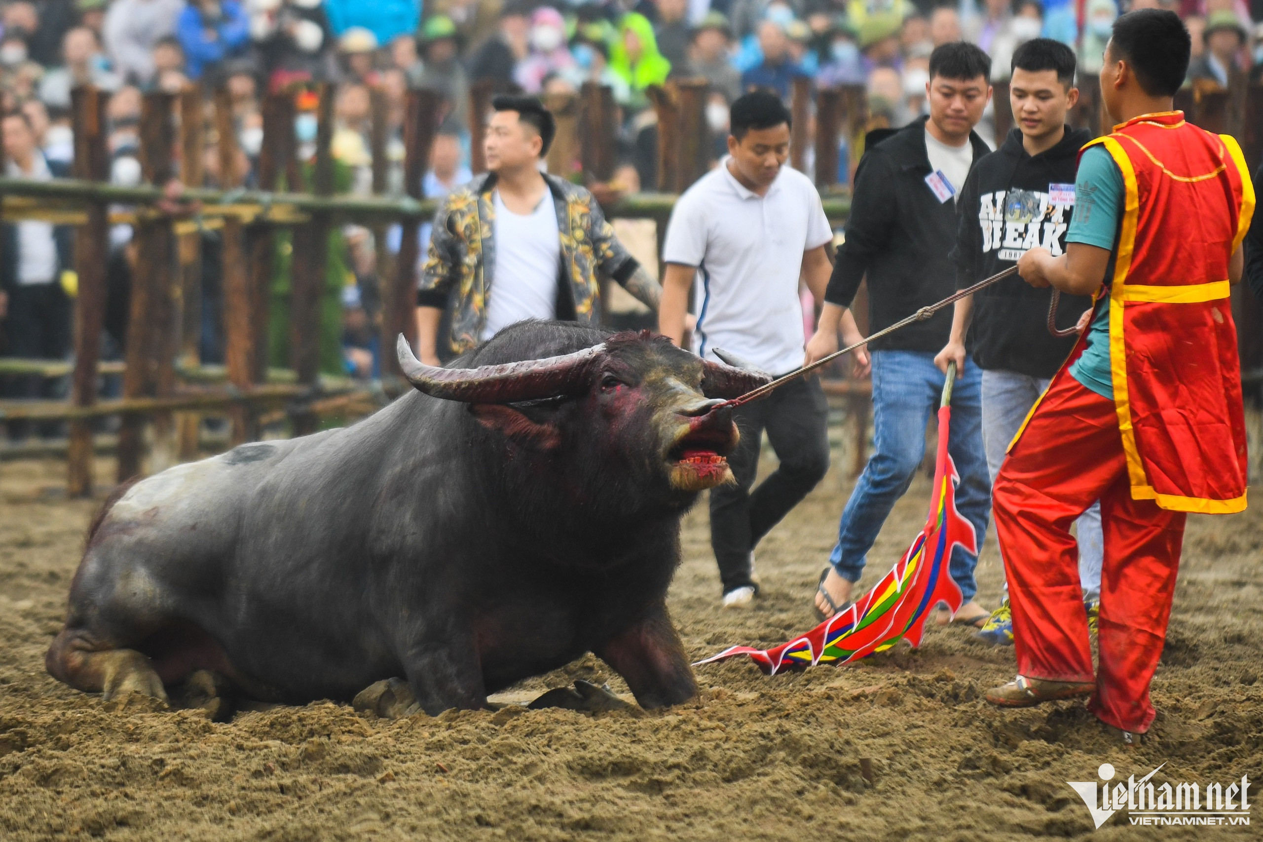 Lúc này, trâu 05 không thể đứng dậy và đi tiếp, chủ trâu và nhiều người phải dùng sức để kéo ra ngoài.