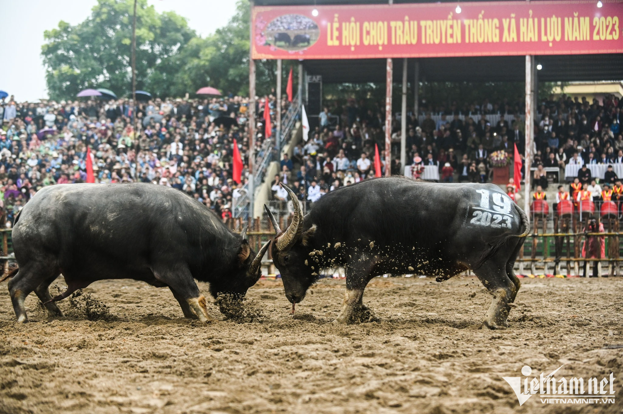 Trâu số 19 của ông Lê Văn Thành và trâu số 01 của ông Nguyễn Văn Bắc có nhiều màn đọ sừng gay cấn khiến khán giả phải nghẹt thở.