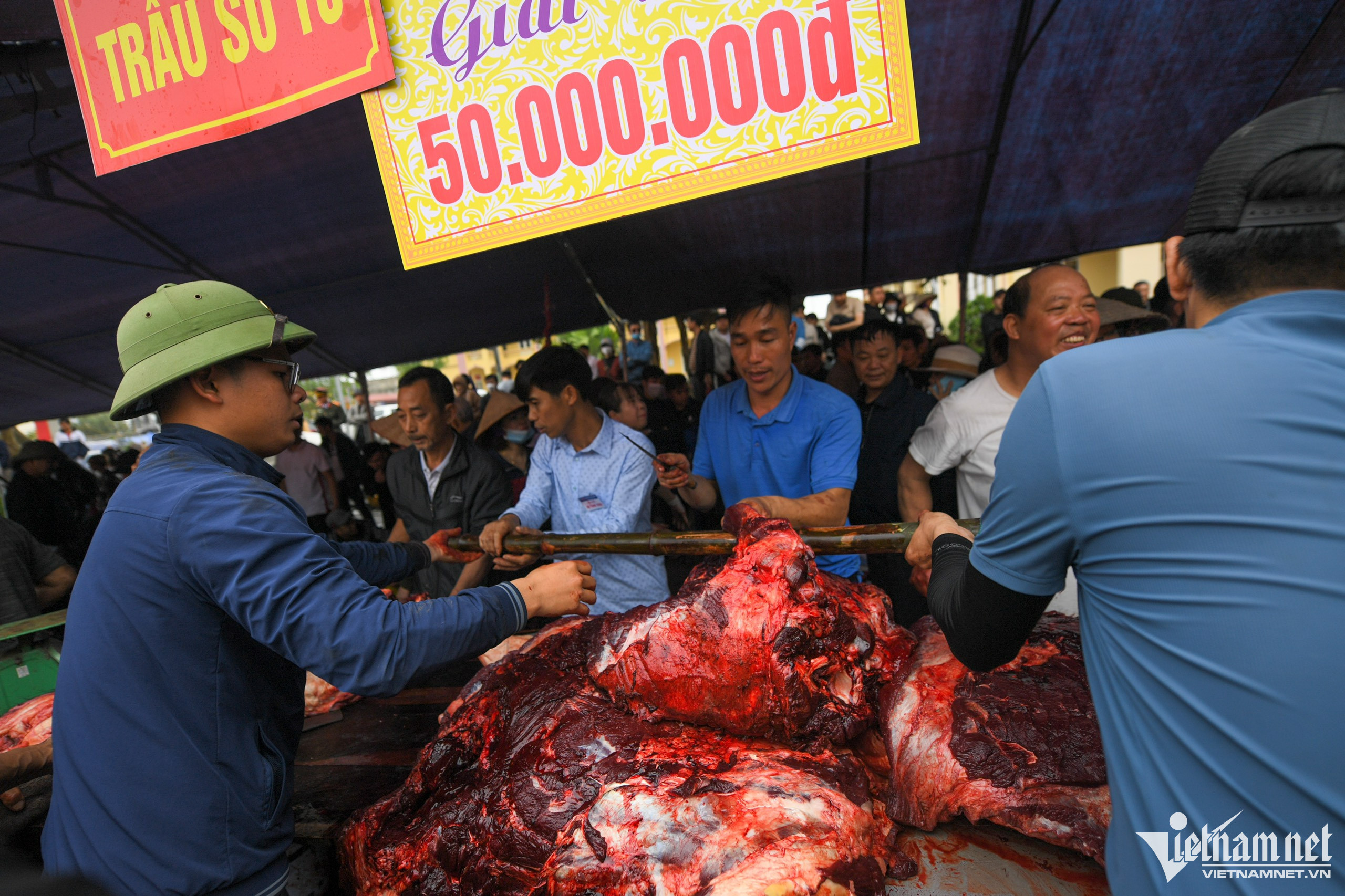 Ngay sau khi trận đấu cuối cùng kết thúc, khoảng 11h, hàng trăm người đổ ra mua thịt trâu chọi đoạt giải. 20 phút sau khi lên ngôi vô địch, trâu của ông chủ Bùi Văn Tám được bán với giá 5 triệu đồng/kg. Nhưng chỉ sau khoảng 1 tiếng do ít người mua, thịt trâu giải nhất được giảm còn 700.000 đồng/kg, còn trâu về nhì là 600.000 đồng/kg.