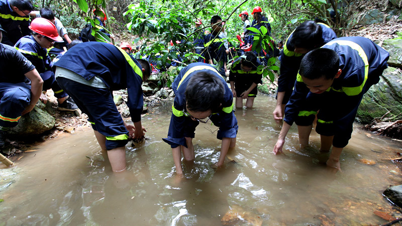 Đây là lúc hào hứng khi đến con suối, các em được thực hành kỹ năng bắt cá làm thức ăn sinh tồn