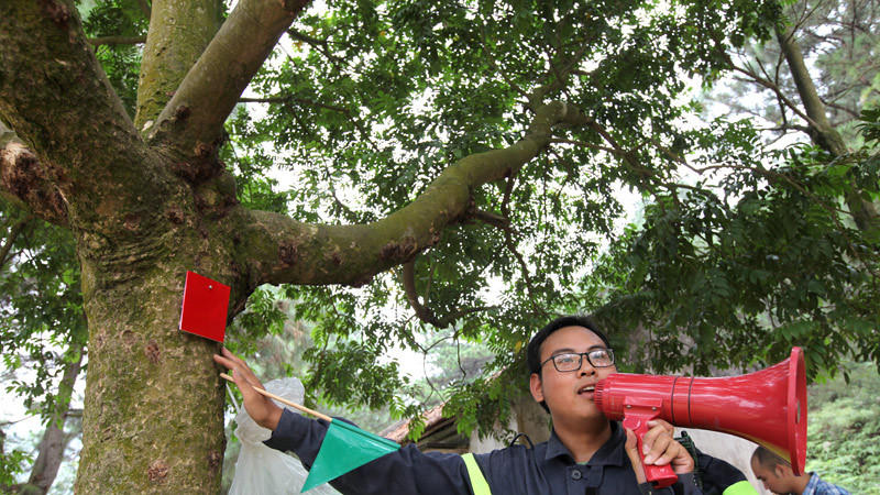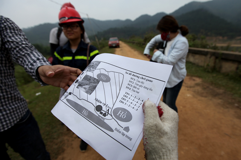 Tình nguyện viên hướng dẫn cách nhận biết các biển báo, chỉ dẫn đã được đánh dấu trong khu rừng trước khi xuất phát