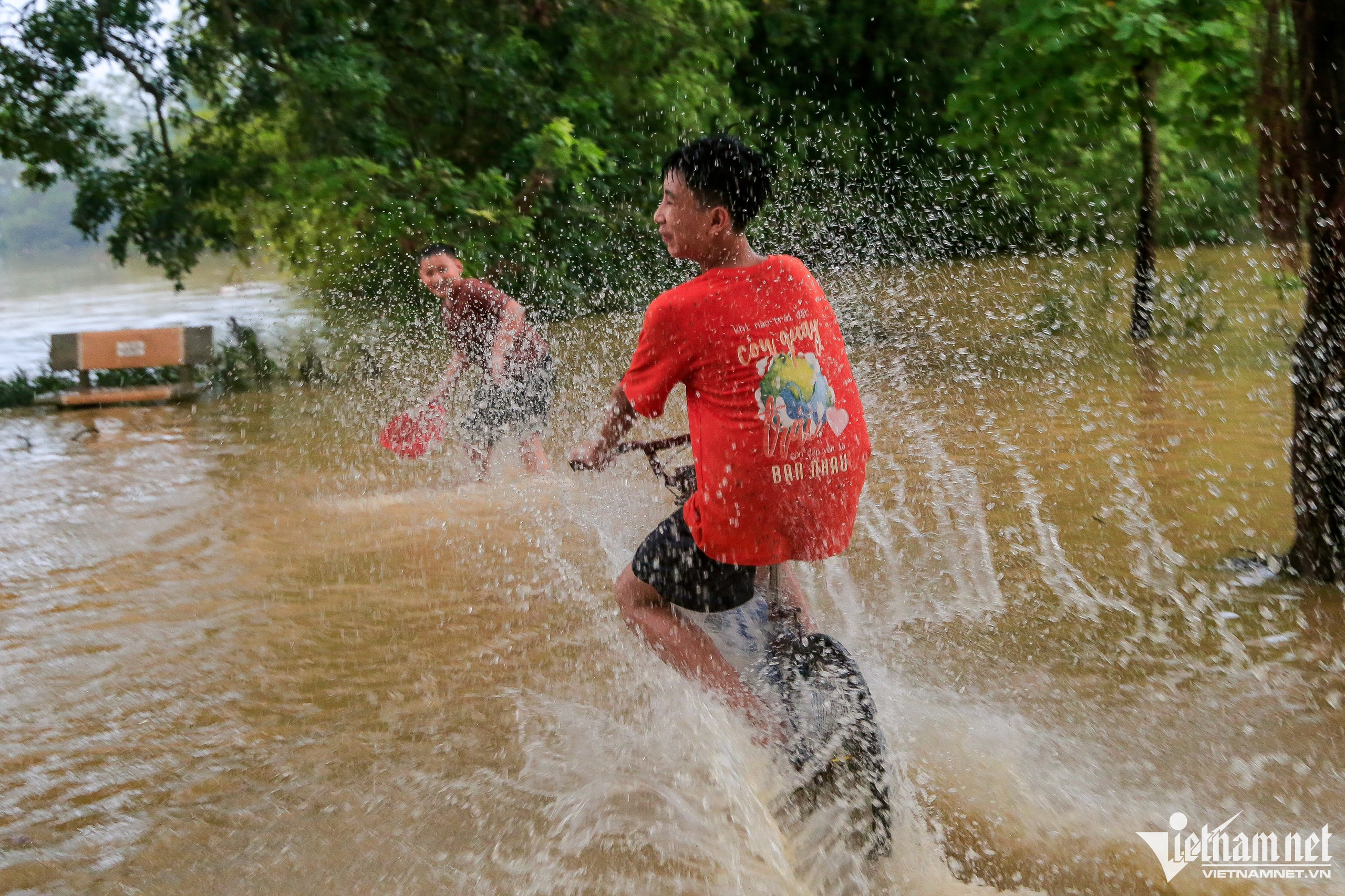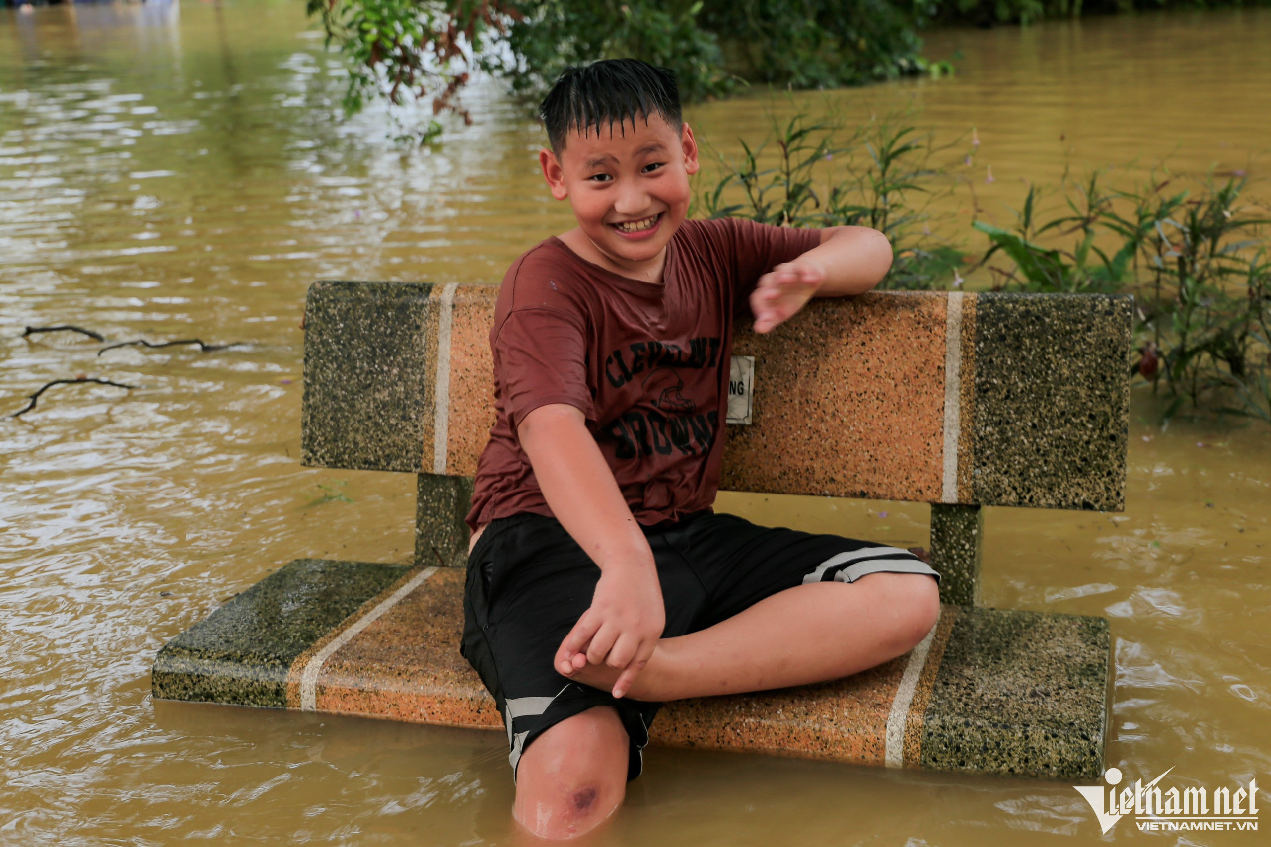 Do tình trạng mưa lớn từ thượng nguồn, mực nước sông Bùi dâng cao đột ngột. Huyện Chương Mỹ và vùng hạ du là khu vực có địa hình thấp trũng rơi vào cảnh ngập lụt. Từ tối 8/9, ủy ban các xã thuộc khu vực ảnh hưởng đọc loa, kêu gọi người dân nhanh chóng sơ tán đồ đạc và di chuyển lên các vùng cao hơn để lánh nạn.Nhà ngập nước, đường đến trường cũng khó khăn, trẻ em trong các thôn chịu ảnh hưởng bởi nước lũ phải nghỉ học. Trong đêm 8/8, rạng sáng 9/9, nhiều em được bố mẹ đưa đi lánh tại nhà người thân, chờ nước rút mới trở về nhà.Trẻ con trong thôn Yên Trình nghỉ học, phải ở nhà vì đường đến trường đã ngập trong nước. Tới chiều, chúng rủ nhau ra khu miếu trong làng để vui chơi.Sống gần sông, hồ, đám trẻ biết bơi từ nhỏ. Các em thoải mái nô đùa ở nơi nước ngập lưng chừng bả vai.Trung Hiếu cũng xách xe đạp chạy ra vui đùa cùng các bạn. “Hôm nay lớp em tổ chức Trung thu nhưng em không đi dự được, em nghỉ học từ sáng”, Hiếu kể.Nguyễn Văn Nhất ngồi mệt lử sau khi chơi đuổi bắt với đám trẻ trong thôn. “Sáng nay bố mẹ đưa em đến trường nhưng đường ngập quá nên lại quay về. Ở nhà cũng không có việc gì làm nên các bạn rủ em đi chơi. Chỗ này cũng không sâu lắm”, Nhất nói.Đám trẻ nghĩ ra đủ trò như bịp mắt bắt dê, đua xe đạp…
